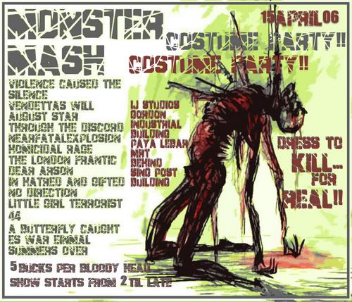 i also went to the monster mash gig at gordon industrial. the studio is pretty hot and the lighting sucks.. except for the waveline 1991 official swimwear for the miss singapore beauty pagent neon sign in the studio. hahahah! but it was super fun. moshing and jumping and shit. so damm hardcore! hahaha! i also got to meet a couple of people ive not seen for really long! people like Cheryl and Nigel :) the animals! woohoo! hahaha! i also met Nadderrah. Pasti+Eerah, Rashid and Ali were there too! hahahaha! oh ya ya.. diyana from sentosa as well. shes so hardcore! \m/ hahahaha! not to mention i met some of nigel's friends. there was Si Hong(shes a girl), super super cool gig chick. like shes friends with theses guys (forgot band name) that performed at mosh06 and played a cover of senses fail's bite to break skin. she had this friend with her too, Luna. apparently everyone was emo yesterday. Nigel was emo coz he couldnt do 11 questiona of math(so glad im not taking A levels anymore) and Luna was super emo coz she just broke up with her boyfriend and he was there at the gig with this other girl. it was her longest relationship with a guy(4 months) but i guess she really liked him. she got neglected by him coz like.. he doesnt put in any effort into their relationship? and apparently.. hes a gemini.. just like nigel and me. hahaha! nigel told her abt his previous relationship and like..she turned hostile on us geminis! ahhhh!! but when i told her about mine..she said im a good gemini! :D YAY! and yes! i do love my girlfriend soooooo much! i wanna be with her forever! no one else but her! <3 HAHAHA!